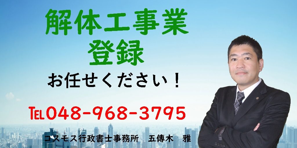 なお、建設業法の「土木工事業、建築工事業、解体工事業、※とび・土工工事業」のいずれかの業種について許可を受けている者は、解体工事業の登録を受けることなく解体工事業を営むことができます。